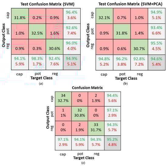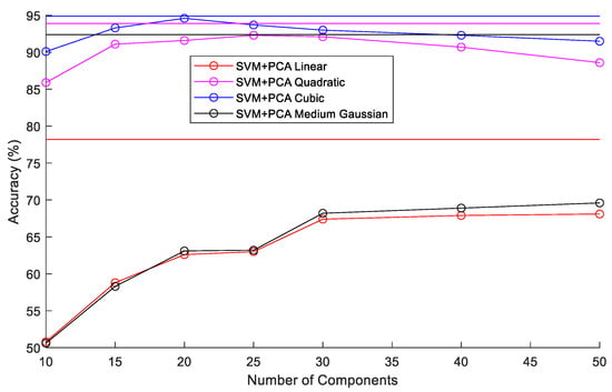 Using 900 predictors in the input space can impair computational time. Hence, PCA [] is used to determine the principal components for feature optimization [,]. This singular value decomposition reduces the data dimensionality and projects it to a lower dimensional environment for the SVM. This naturally comes at the expense of accuracy. Hence, it is important to compare the SVM + PCA classifier accuracy with the SVM only classifier.