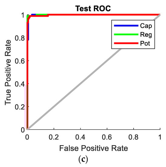 ROC curves of the best classifiers. (a) SNN with 80 hidden neurons; (b) SVM + PCA with 20 components; (c) CNN with Configuration 1.