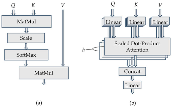 The attention mechanism [11] utilizes the attention block to assign different weights to each part of the DNN input, and extract more critical information for achieving better performance. It is widely used in applications such as machine translation, voice recognition, and image recognition, etc. The structure of the attention block (or the scaled dot-product attention block) is shown in Figure 1a. Based on the input vector, the attention mechanism obtains query vector Q through the Query matrix, key vector K through the Key matrix, and value vector V through the Value matrix. The attention score can be obtained by multiplying Q and K, then scaling and normalizing the product by the SoftMax function to obtain the attention weight, which is in turn multiplied by V to produce the output. Unlike recurrence-based models, such as the recurrent neural network (RNN), which have to sequentially check each input vector one by one, the attention mechanism can check all input vectors simultaneously to determine which input vector has a higher attention score to be paid more attention to. It thus has better performance than its counterparts. If the attention mechanism considers many queries, it is called a multi-attention mechanism and can be realized by multi-attention blocks, as shown in Figure 1b. It can be regarded as running through the attention mechanism multiple times (say, h times) in parallel. Each running of the attention mechanism can pay attention to different parts of input vectors to have an independent output result. All the attention output results are subsequently concatenated and linearly transformed to be the final output.