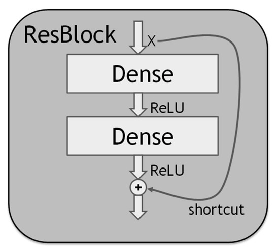Increasing the depth of a DNN usually improves its performance. However, the depth increase causes the gradient vanishing problem so that the gradient approaches zero; it also causes the gradient exploding problem so that the gradient becomes excessive. The two problems may make the DNN weight update insensitive to output changes; thus, it is sometimes difficult for the DNN training error to converge. Although batch normalization can mitigate the two problems, there still exists the degradation problem that deeper DNNs may have worse performance than shallower DNNs. The residual block (ResBlock) [12], whose structure is shown in Figure 2, can be used to alleviate all the problems, as described below. The ResBlock has the normal dense layer with the ReLU (Rectified Linear Unit) or another activation function. In particular, it has the shortcut connection of identity mapping. With the shortcut, the ResBlock can learn the residual (i.e., difference) between the input and the output of the block. It can thus focus on the residual, which is more significant. As such, it is more sensitive to output changes and can mitigate the gradient vanishing, and the gradient exploding problems, which in turn can alleviate the degradation problem.