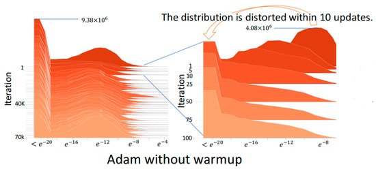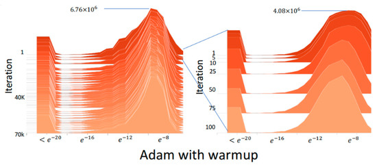 Figure 3 shows the absolute gradient histogram during training a DNN using Adam without warmup for machine translation on the IWSLT2014 German-English (De-En) dataset [14]. In the histogram, the y-axis is the iteration (epoch), and the x-axis is the absolute gradient value in a logarithmic scale, whose height stands for the frequency. It can be observed from the histogram that using Adam without warmup makes the gradient distribution distorted to have mass centers of relatively small values in the first 10 iterations, which indicates the training may fast converge and be trapped in local minima after the first few iterations. Figure 4 shows the absolute gradient histogram during training a DNN using RAdam (i.e., Adam with warmup) for machine translation on the IWSLT2014 De-En dataset [14]. It can be observed from the histogram that the gradient distribution is not distorted after the first few iterations. This can avoid the bad situation that the training fast converges and is trapped in local minima.