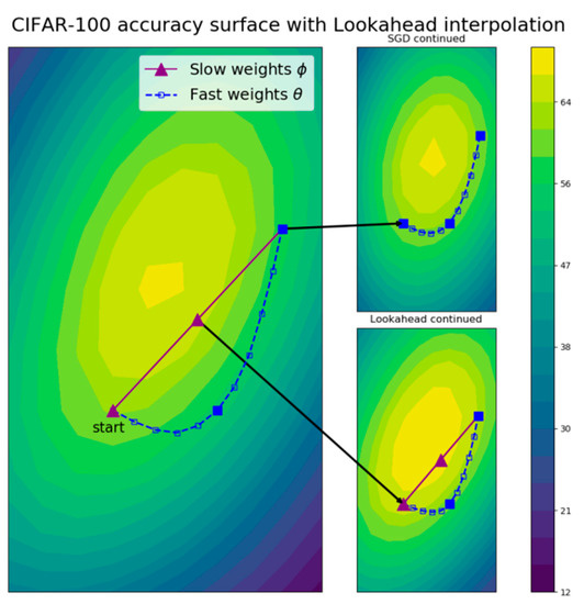 Figure 5 [15] is the visualization of Lookahead effects with k = 10 for training the ResNet-32 model [12] using stochastic gradient descent (SGD) as an image classifier on the Canadian Institute For Advanced Research-100 (CIFAR-100) dataset [19]. The figure shows the test accuracy surface of the model using fast weights indicated by the blue-dashed path, and slow weights indicated by the purple-line path. It can be observed from Figure 5 that Lookahead can quickly progress to the global minima than SGD.