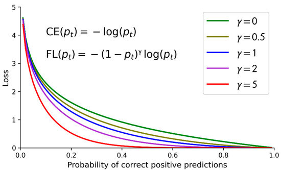 Figure 6 shows the CE and the FL with data imbalance parameter αt = 1 (for not considering data imbalance) and γ = 0, 0.5, 1, 2, and 5 [16]. Note that the CE is actually the FL with γ = 0. The y-axis is the loss, and the x-axis is pt, the probability to correctly predict the input sample to be positive. It can be observed from Figure 6 that the well-classified samples or examples (i.e., those with pt larger than 0.5 and even close to 1) are associated with the FL that fast approaches 0 when pt grows. The FL approaches 0 faster than the CE. It can also be observed that the FL sets the loss of well-classified examples to be small, and sets the loss of misclassified examples to be large.
