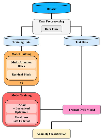 The proposed method builds the DNN that combines multiple attention blocks and residual blocks. Figure 9a shows the DNN without multi-attention blocks or residual blocks, whereas Figure 9b shows the DNN with multi-attention blocks and residual blocks adopted by the proposed method. In the DNN shown in Figure 9b, the first layer is the input layer. Then, there are t (say t = 6) copies of the dense layer, the multi-attention block layer, and the residual block layer, with each layer having eight neurons. The flatten layer and the dense layer then follow. The last is the output layer. In total, the DNN has 51 layers, with the last layer using the SoftMax, and the other layers using Swish [20] as the activation function. It is shown that the Swish function can help mitigate the gradient vanishing problem [20]. The He normal initializer [21] is employed to initialize neural weights. The initializer draws samples from a truncated normal distribution and is shown to have good performance.