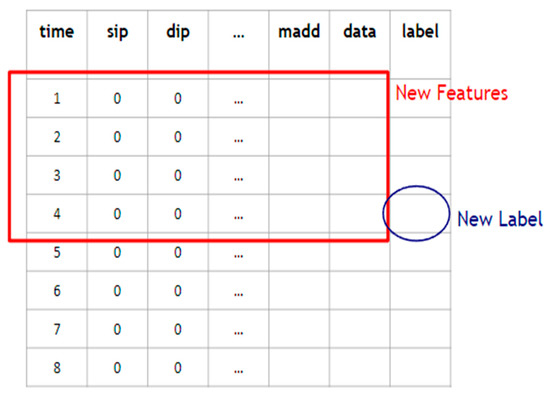 If two packets have an identical pair of the source IP address and the destination IP address, then they are considered to belong to the same flow. Packets of the same flow are sorted by timestamps. As shown in Figure 8, new features are derived form a sliding window of s (say, s = 4) consecutive packets of the same flow, and the label of the sth packet is taken as the new label associated with the new features. In this way, the new flow-based data are derived. When an attacker launches an attack, he/she usually sends multiple malicious data packets to the same target device, causing anomalies. Therefore, finding related packets with the same source and destination IP addresses through the data flow processing is very helpful for anomaly classification.