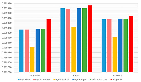 The proposed method utilizes many mechanisms. First, it uses the flow-based data investigation mechanism. It also uses the DNN with the mechanisms of the multi-attention block, the residual block, the Ranger optimizer, and the focal loss. The performance impact of not adopting a single mechanism is assessed. Figure 10 shows the performance evaluation of six different cases of mechanism combinations. In case 1, flow-based data investigation mechanism is not used; instead, per-packet investigation mechanism is used. Case 2 omits the muti attention block mechanism, whereas case 3 omits the residual block mechanism. Case 4 uses the Adam optimizer to replace the Ranger optimizer. The cross-entropy, instead of the focal loss, is used in case 5. All mechanisms are used in case 6. It can be observed that the combination of all mechanisms has the best performance. Furthermore, the residual block mechanism has the most impact on performance, as not using it leads to the worst performance. As to other mechanisms, they have less and similar impacts on performance than the residual block mechanism.