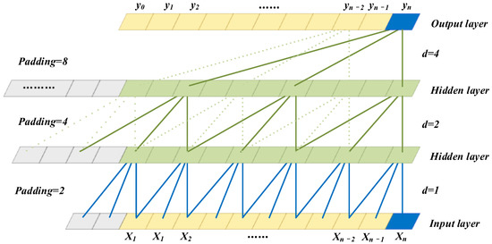 Since there is no recurrent connection in casual convolution, a parallel input of time series data can be adopted, so causal convolution has a faster training speed than RNNs, particularly for the large sample time series [24]. However, when dealing with long sequence data, causal convolution requires a deeper network structure or a large convolution kernel to enhance the receptive field of neurons in a neural network. For this reason, the TCNs have been combined with the DCC technology. The dilated causal convolution has been achieved by introducing the dilated convolution into the causal convolution so as to increase the receptive field, which can be expressed as follows: