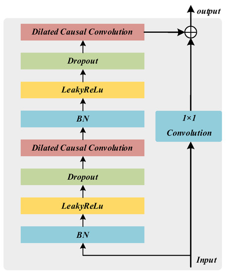 Batch normalization (BN) [28] has usually been required for deep network training. The BN uses the mean and standard deviation of small batches to adjust the intermediate output of a network, which improves the stability of the intermediate output and minimizes overfitting. The activation function and BN have usually been added after the convolution operation in the conventional CNN structure. Many studies on primitive residual networks have analyzed how the combination of activation function and BN at different locations affects the network performance [29]. The results have shown that the fully pre-activated structure is superior to other structures in reducing overfitting and improving the generalization ability of the network. Therefore, this study aims to achieve full pre-activation of the residual connection by adding the activation function and BN before the dilated causal convolution. The improved residual structure is presented in Figure 2.