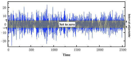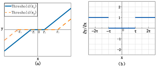 Shrinkage processing refers to soft thresholding, which is a function that shrinks input data in the direction of zero to retain negative or positive characteristics and sets the characteristics approaching zero to zeros. In this way, it has been proven that useful information can be well preserved and noise related features can be eliminated [30]. The soft-thresholding function is given by Equation (3), where and are the output and input features, respectively, as shown in Figure 3a; they are two soft threshold functions with different thresholds. The boundary in the soft-thresholding function is controlled by a threshold, whose value in the interval of is set to zero. The soft-thresholding function can adjust the threshold value to shrink, as shown in Figure 4. Meanwhile, the soft-thresholding function’s derivative is defined by Equation (4) and presented in Figure 3b, where it can be seen that the derivative of the soft-thresholding function is either zero or one. Therefore, using the soft-thresholding function is beneficial to prevent gradient and exploding.