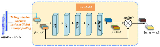 The working mechanism of the adaptive shrinkage processing is illustrated in Figure 5. Suppose that the input tensor is, having rows and columns; namely, characteristic graphs are used to calculate the absolute value of the input layer tensor one by one, and then the average value of each column is calculated in the global average pooling layer; the average value has one row and matrices, and it is represented by and processed by the full connection (FC) layer and the BN layer in turn. The activation function of the last FC layer is set to the “Sigmoid” function so that the shape invariant is in the range of. Through the process of multiplying and by elements, each feature map has its own threshold vector , as the result of adaptive shrinkage. Finally, the input feature and soft threshold vector realize shrinkage processing via Equation (3).