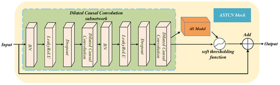 The AS-TCN block consists of DCC and an adaptive shrinking sub-network. After a series of operations, the input data, which represent a picture with redundant information and degradation features, are input to the TCN block, and different thresholds are obtained by the adaptive shrinkage subnetwork for different features. Next, the soft threshold function is used to eliminate redundant information to retain degenerate features. Moreover, the TCN block uses an identity path to reduce the difficulty in model training. The internal details of the DCC sub-network stacked with custom layers are presented in Figure 6. The LeakyRELU activation function is used at the cost of gradient sparsity, so the module is more robust in terms of optimization [31].
