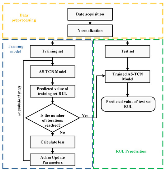 The RUL prediction process is illustrated in Figure 7, where it can be seen that data collection is performed first, and then sensor signals from different channels are collected. Next, the signals are standardized, and the preprocessed data are divided into test and training sets. Then, the training set is used to train the network through a predefined number of iterations. During the model training, the back-propagation method is used; the Adam optimizer is employed to reduce the loss function value (loss), and the optimal structural parameters are determined. After 200 iterations, the trained network model is obtained.