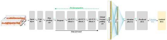 The structure of the RUL prediction network based on the AS-TCN designed in this paper is shown in Figure 8. The sensor data collected from the two channels, namely the vibration signals in the x and y directions, are used as the network input. The two-dimensional input tensor passes through the one-dimensional roll-up layer, the maxpool layer, the dropout layer, three stacked TCN modules, the Global-Average-pool block and a full connection layer. The dropout layer is used to reduce overfitting, compare the network output with the actual RUL value and back-propagate the error.