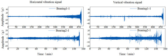 The proposed prognostic method was validated using two accelerated rolling bearing degradation test datasets. The bearing operation-to-failure dataset [32] released by the IEEE PHM2012 Data Challenge was measured by the PRO-NOSTIA test rig, as shown in Figure 9. The data were collected by two acceleration sensors in the horizontal and vertical directions, separately; the sampling frequency was 25.6 kHz, and the data were recorded every 10 s for 0.1 s, so the vibration data for each sampling included 2560 points. For safety reasons, the experiment was stopped when the amplitude of the vibration data exceeded 20 g. The measured bearing failure time was defined as the time when the amplitude was greater than 20 g. The proposed prediction model was verified by using the operation-to-failure data under conditions one and two, as shown in Table 2. The life cycle data of bearings 1-1 and 2-1 are shown in Figure 10.