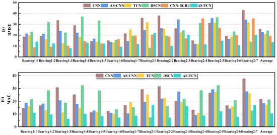 As in Experiment Case I, we used cross validation to deeply evaluate the RUL prediction performance of AS-TCN and other methods. The data set division and experimental results are shown in Table 8. From Table 8, we can see that AS-TCN is superior to other methods in most bearing tests. Table 9 is the mean value of MAE and RMSE of several different methods. It can be seen that, compared with the DSCN model [33], MAE and RMSE values decreased by 48% and 42%, respectively. The results show that AS-TCN is superior to other technologies in bearing RUL prediction.
