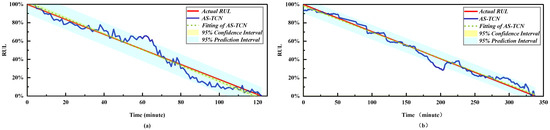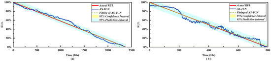 RUL prediction results of the AS-TCN. (a) Bearing B1–1. (b) Bearing B2–5.