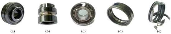 Photos of normal and degraded bearings. (a) Normal bearing; (b) inner ring wear; (c) roller fracture; (d) outer ring wear; (e) outer ring fracture.
