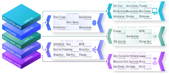 Security and privacy concerns emerge with every new technological discovery [82]. The IoT brings a paradigm for the interaction of digital devices that have sensory and communicative strengths. Figure 1 provides layers-based taxonomy of possible security attacks in an IoT environment, adopted from [83,84,85].