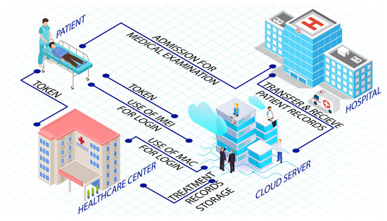 The authors in [87] proposed a cloud-based authentication and authorization scheme using cryptographic techniques as shown in Figure 2. This scheme mitigates medical resource misuse; a patient gets logged in to a public cloud through a mobile device using its credentials (username and password). However, the scheme is kept without a password and identity table being saved in a database. Hence, against attacks such as offline password guessing attacks, replay attacks, impersonation attacks, man-in-middle attacks, and insider attacks, the scheme provides a secure defense. In the proposed scheme, all patients and the hospital administrator are restricted from getting signed in with the public cloud. As a result, a personal attribute is utilized to generate a session key specifically for the user being logged in, such as a patient or hospital administrator. This session key is utilized by patients to get access to all the possible facilities being offered via the cloud. Usually, a patient has to be admitted and provide examinations to receive healthcare services. The healthcare staff then uploads the content with the patient’s healthcare information while acquiring the patient’s approval. Once such information is available on the cloud, any registered user can utilize it for any authorized task. During this process, the patient also permits the use of information through tokens. After successful authentication, a mobile application is used by the patient to generate its authorization token. The patient also has to authorize the hospital; later the authenticity of the patent is validated by the administrator. Once approved by the administrator, the tokens are sent to the public cloud. The next step is to check the token available in the public cloud. If the token is found to be correct, only then can the patient’s treatment report can be accessed from the hospital, and the doctor can supply the patient with the relevant advice. It was reported that the communication cost of the proposed scheme is 7168 bits, whereas the current system requires 0.7168 ms for the data transfer of 10 Mbps bandwidth network infrastructure.