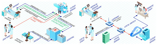 An elliptic curve cryptographic-based framework for smart medical systems is proposed in [90]. The architecture works on wireless sensor network (WSN) technology, wherein the doctor provides a patient with online healthcare services via a cloud-oriented application program on a mobile device. It is reported that for such scenarios, security and privacy are the main issues for the users of cloud-based smart medical systems. Therefore, they designed an architecture to ensure security and privacy by using lightweight cryptographic key generation elliptic curve cryptographic for the proposed smart medical system. The four entities—patient, doctor, cloud server, and health care centre—are passed from their proposed scheme. These entities are processed in six phases: registration, smart medical system, uploading patient health records, treatment and checkup records, and a unique emergency phase, as shown in Figure 5.