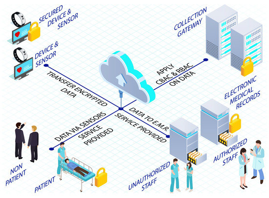 The authors in [89] have proposed an enhanced security model with the functionality of authentication and authorization functionality while discovering the new multi-authority encryption-based attribute (MA-EBA) technique to protect healthcare against attacks by unauthorized users as illustrated in Figure 4. The method improves device scalability and allows the user to attain fine-grained access. In the proposed model, the user provides their identity, password, and personal biometric information in the first phase. The admission department generates a request for a service to obtain a request from the database and cloud servers. Upon request by the service administrator, the health requester (DAR) accesses the patient’s stored personal health information. Only DAR can decode personal health information (PHI) after patient satisfaction and access policy definition. When seeking entry to PHI, the single point of contact (SPoC) tests whether the user has been granted access to fetch records from the database. Hence, access to the service becomes the key aspect; thus in a successful scenario, the administrator can access patients’ information. Therefore, the information, PHI, is sent while utilizing the MA-EBA framework, which has been presented in Figure 3. However, if an adversary gets too close to the patient, it can acquire its login information and cause damage to the system. Therefore, the proposed scheme is vulnerable to hijacking attacks.
