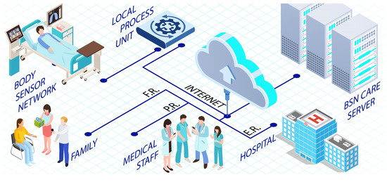 According to the World Health Organization (WHO), human life expectancy has improved, and most people are likely to live more than 60 years [8]. Older adults are more vulnerable to infectious illnesses, disorders, and hospitalization [9]. According to an estimation made in 2008, the elderly population across the globe was approximately 506 million, which will further be increasing to around 1.3 billion by the year 2040 [10]. Technologies based on wireless sensors provide facilitation to patients and elderly populations specifically—i.e., those who require constant monitoring [11]. The deployment of medical sensor networks in healthcare applications has drastically improved the healthcare sector in the 21st century [12,13,14]. Humans who serve as actors in healthcare infrastructures, such as patients, doctors, staff, etc., have been involved in such wireless networks directly in a limited manner to increase the portability of gadgets and achieve higher transfer rates, along with keeping communication and other beneficiaries secure [15]. Small medical sensors are kept in close proximity to the patient and rarely connected with the body [16,17]. Their service is to monitor changes in the physiological state of the patient promptly. These sensors observe patient vitals and usually communicate them through a gateway to some distant remote site, for detection of possible change [18]. During this process, human intercession is decreased to a minimum level [19]. A specialist can utilize these readings to append an expert appraisal of the patient’s well-being. The most common vital signs include heart rate, temperature, blood pressure, body movement, pulse-oximetry, etc. [20,21]. Such a critical observation and fine-grain attention to detail benefit patients while also making a thorough health history [22].