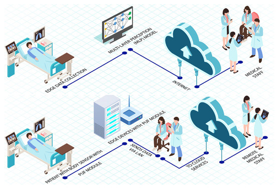 A study conducted in [114] introduces a computer authentication protocol used to authenticate network devices. The authentication process is performed without data being stored in memory. In the PMsec method, as shown in Figure 9, each device would incorporate a PUF module. All the sensors and devices in the IoMT get their unique identities from this module. The protocol’s initialization happens any time a new device establishes a link with the network. The server utilizes the PUF module to enroll different keys throughout the process. A REQUEST input R1 is transferred to the said module. Consequently, a RESPONSE is given to the PUF module at the end devices for R2 response. The second response (R2) is again sent to the said module. Furthermore, a third response (R3) is generated where the hash of the same is also calculated as X = h (R3). The hash X and CHALLENGE input C1 are contained in the database. The device inputs a challenge message toward the node, which produces a hash value called X/. Hash values X/ are matched with the already stored value X for authentication of the device. However, device information is not stored explicitly in the cloud log, which provides an extra layer of security to the system.