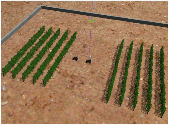 The simulation was developed within the open-source Gazebo simulation environment. Gazebo is the standard for the simulation of virtual environments and has a strong integration with the ROS environment. It features a physics engine for studying the dynamics of the robotic system and provides accurate visualization. To recreate a realistic virtual vineyard, a 3D model of a vineyard was utilized. Vineyard rows were created by positioning repeating vineyard models opposite to each other at a realistic row width of 2.5 m. The ground was a flat surface with friction characteristics similar to soil. The simulation environment can be seen in Figure 1.