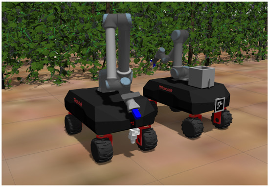 The simulated robots were the Robotnik Vogui robots [33]. These are the robots that are to be used in the eventual field experiments. The libraries provided by Robotnik include the built-in tools to simulate up to three robots in the Gazebo simulation environment. In this study, a two-robot simulation is presented, with an expert robot and a helper robot. The expert robot possesses a Universal Robots UR-5 arm equipped with an OnRobot RG2 gripper. On the other hand, a larger UR-10 arm of Universal Robots with a Schunk EGH gripper is mounted on the helper robot. The expert robot’s role is to perform the actual harvesting operations (detection and picking of grapes), while the helper robot assists the expert robot by carrying the grapes that the expert robot harvests. This is the reason why the helper robot is equipped with an arm with a larger payload compared to the smaller UR-5 arm mounted on the expert robot. In addition, the helper robot is equipped with a ZED mini stereo camera mounted on the end effector of its UR-10 arm, used for marker detection. Correspondingly, an 11 cm × 11 cm ArUco marker was placed at the back of the expert robot. ArUco markers, provided by the OpenCV library, are binary square fiducial markers consisting of a binary matrix code to allow identification and a black border which enables fast detection. They are extensively used for camera-based pose estimation because of fast and reliable detection.