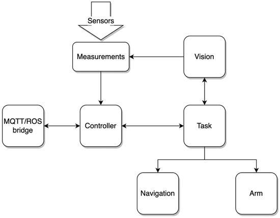 The entire robot system is controlled by the Controller node, which is responsible for communications with the base station and with other robots for gathering the statuses of the various devices and for initiating and stopping the task itself by sending the relevant commands to the Task node. More specifically, the Task node is directly controlled by the controller node and performs the actual algorithm for the prescribed task. It contains the necessary functions that enable the node to send commands to the subsystems necessary for the completion of the task, such as navigation, arm movement, etc. These commands are issued in the order specified by the task. The Navigation node is responsible for moving the robot in various poses given appropriate commands from the Task node and by taking into account the relevant position sensors information. Similarly, the Arm node is responsible for performing the necessary arm and gripper movements according to Task node commands. The Vision node controls the camera and returns the appropriate data when requested by the Task node. In this paper, the Vision node is active only on the helper robot and performs ArUco marker pose estimation through the use of the aruco_detect ROS package. Finally, the MQTT/ROS bridge node translates ROS messages into MQTT format and vice versa.