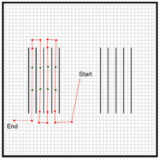As can be seen in Figure 9, the path includes both a trajectory outside a vineyard row (red dots) as well as work waypoints where harvesting must occur (green dots), i.e., where the robots must position themselves properly in preparation for the harvesting task. The work waypoints are positioned to be equidistant from the plant rows so that the maximum spacing of the robots from the plants is achieved. The waypoints which are outside the vineyard rows are selected such that the correct turns towards the vineyard row are ensured. Finally, where possible, the waypoints are spaced far apart in order to prevent the robots from stopping frequently or approaching each other unless it is necessary for the harvesting task. Therefore, this path is suitable for testing all aspects of the navigation algorithm presented in the previous section. It must be noted that the selected path pertains primarily to the expert robot since the expert robot directly follows the path, whereas the helper robot visits locations that the expert robot transmits. This is why the initial position shown in Figure 9 is actually the expert robot’s initial position.