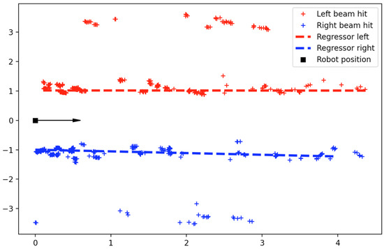 Finally, a robot needs to correct its pose relative to the vineyard rows on its sides. For this operation, a method that utilizes the 2D LiDAR sensor was developed. The LiDAR continuously measures the distances to the objects each beam is reflected on and publishes this information to the system. When the navigation node is required to correct the robot’s pose, then the last LiDAR scan is stored and is processed as follows: the measured distances are partitioned into measurements on the left and on the right side of the robot. From these distances, and given the location of the LiDAR sensor (assumed to be at the origin of the local reference frame), the coordinates of the beam hits are calculated. Then, the RANSAC algorithm [37] is applied to these points in order to estimate the parameters of a linear model which describes each row. An example of this process is illustrated in Figure 5. With the LiDAR sensor located at (0, 0) and the robot facing to the right of the image, a map of the various detected locations can be constructed (red and blue crosses). The RANSAC algorithm produces the linear models of the vineyard rows on the left and right side of the robot (red and blue dashed lines, respectively). From the parameters of the linear model, the slope of the rows on the left and right sides of the robot can be determined and then compared to the robot’s orientation, which is at zero in this local coordinate system. The error angle (i.e., the angle that corrects the robot’s orientation to achieve a direction parallel to the row) is defined as the mean between the slopes of the linear models on the left and right sides of the robot.