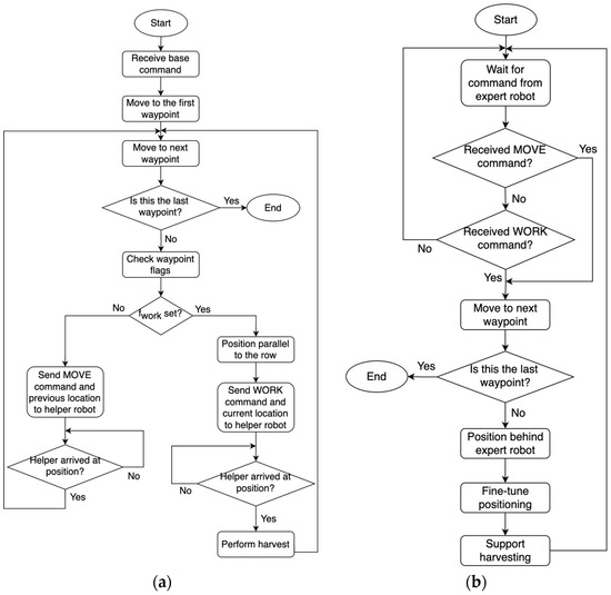 While the individual robots navigate by planning their motion from waypoint to waypoint, as described in the previous section, they also need to coordinate their motion so that they move in an orderly fashion, maintain control of the flow of the task, and ensure that the robots position themselves correctly in preparation for collaborative task execution. For this reason, a modular coordination strategy has been developed. The strategy employs the localization and navigation modules described in the previous section. The proposed strategy consists of two algorithms, one for the expert and one for the helper robot. It has been designed to ensure the correct operation in all phases of the task, including navigation from the initial position to entering a vineyard, navigation inside the vineyard rows, and the positioning of the robots relative to each other in preparation for the actual harvesting task. At the same time, in order to ensure safe operation, it was decided that the motion would be strictly regulated with the two robots moving alternately. To implement this, the two algorithms operating on each of the robots are triggered at various points using the communication module. The navigation algorithms for the expert and helper robots are illustrated in Figure 6.