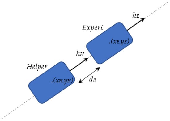Initially, the expert robot proceeds to the first waypoint it has received from the base station. When the expert robot arrives at the next waypoint, it checks the additional fwork flag that accompanies the coordinates of the waypoint. If the fwork flag is not set, then the expert robot proceeds to the next waypoint and sends its previous location to the helper robot. Upon receipt of this message, the helper robot moves to the transmitted location and notifies the expert robot of the completion of its move, which allows the expert robot to proceed to the next waypoint. On the other hand, if the fwork flag is set, it means that the expert robot needs to stop, adjust its orientation so that its longitudinal axis is parallel to the row, and correct its lateral position so that its robotic arm can reach and harvest the grapes, on the robot’s side. When this positioning is completed, the expert robot then transmits its current pose together with a relevant command, which forces the helper to position itself behind the expert robot. The helper robot then approaches the expert robot from behind so that it stops at a predefined distance, dR, with the same orientation as the expert robot, as illustrated in Figure 7.