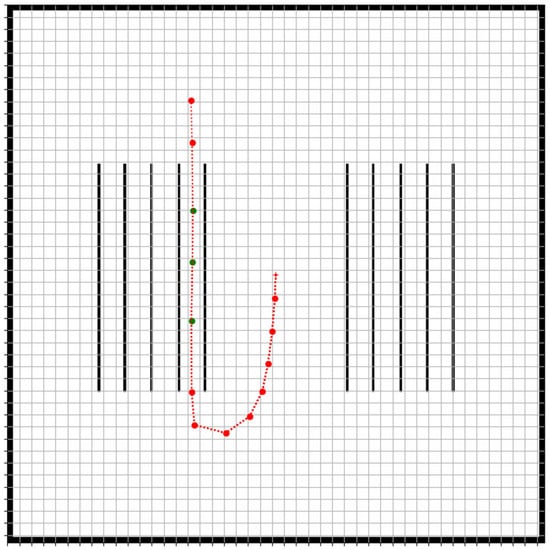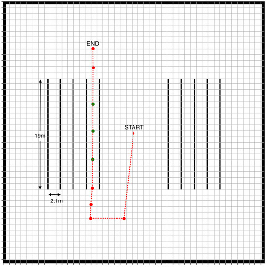 The final aspect of the proposed strategy’s evaluation was aimed at investigating the effect of waypoint selection on the accuracy of the navigation of the two robots. In order to test this aspect, a second path was designed, and in this case, the path consisted of denser waypoints as the robots approached the vineyard corridor. This second path is illustrated in Figure 10 below.