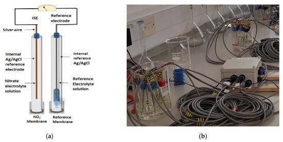 Ion-selective electrodes for nitrate sensing: (a) schematic representation of an ion-selective electrode; (b) prototype nitrate sensors connected to an IoT sensor node.