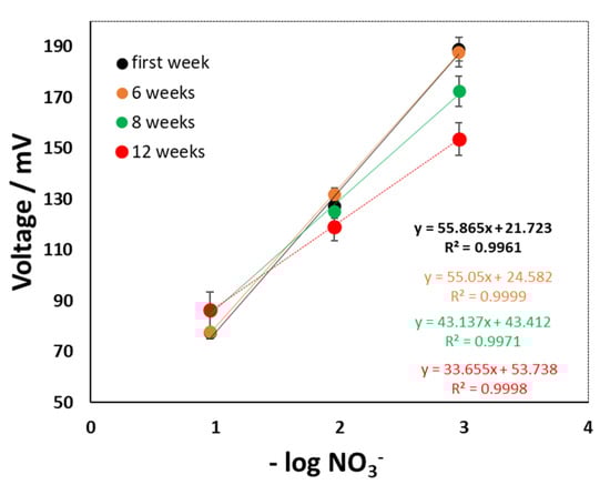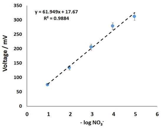 The electrodes were conditioned with 100 mM of NO3− solution overnight to equilibrate the membrane until a stable voltage was obtained. The voltage was continuously monitored at room temperature (22 ± 1 °C) under non-stirring conditions. After conditioning, electrodes were calibrated with six NO3− standards with different concentrations of NaNO3 (from 10−6 M to 10−1 M). The ion-selective electrode generates a voltage across its membrane that varies with the molarity of the solution. The measured potential difference is proportional to the logarithm of NO3− ion concentration. Electrode potential was calculated using an experimentally determined Nernstian slope response against the logarithmic NO3− solution concentration [28]: