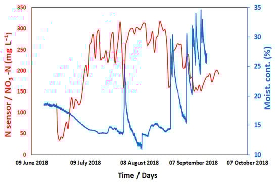 Field trials were conducted during the 2018 growing season at the Henfaes Research Centre, Abergwyngregyn, Wales (53°14′19″ N, 04°00′55″ W). NO3− sensors were connected to GP2 dataloggers (Delta-T-Devices, Cambridge, UK) which support the 12 analogue inputs with the readings combined into a single dataset. The output from the N sensor successfully tracked NO3− in the soil during the whole field trial. Figure 4 shows NO3− concentrations measured using the soil sensors over a period of three months plotted alongside soil moisture data (Acclima TDT-SDI-12 Soil Moisture Sensor). Overall, this shows soil NO3− concentrations increased during the early growing season in response to a progressive reduction in soil water content (which concentrates NO3−) and the rapid nitrification and production of NO3− which occurs in this soil [31]. It was observed that the N sensor’s reading was responsive to changes in soil moisture content. The soil moisture curve shows a rapid and strong response to individual rainfall events (e.g. in early August), leading to a short-term reduction in the N sensor reading due to a dilution of NO3− in the soil water. In September repeated rainfall events lead to a longer-lasting increase in soil moisture content and a reduction in soil NO3− levels (due to dilution). Even in extreme drought conditions, the sensors continued to give readings, though some discrepancy in data is expected during dry soil conditions.