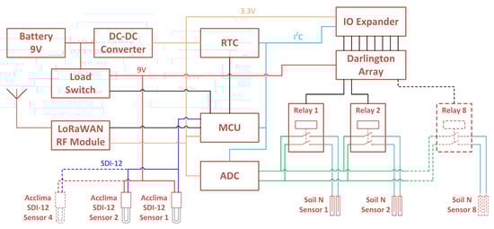 Each of the soil N sensors is multiplexed to the ADC using relays selected by the I/O expander and Darlington transistor array. The Acclima soil moisture sensors are all connected to a single SDI-12 serial bus, with each sensor having a unique address pre-programmed before being connected to the node. The Acclima sensors measure four soil parameters: volumetric water content, soil temperature, bulk relative permittivity, and soil electric conductivity.
