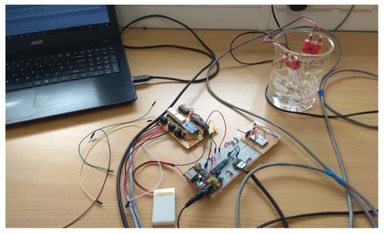 Figure 6 shows an early prototype sensor node undergoing laboratory tests, with two N sensors multiplexed to the node and immersed in a solution of known NO3− concentration. The aim was to check that the multiplexing and relays were working correctly (i.e. they were able to switch between the N-sensors) and that the ADC was able to correctly measure the output voltage from the N sensor as this has a high impedance output. The voltages measured by the prototype IoT node were within 0.3% and 0.2% respectively of the voltages as measured by a Delta-T GP2 datalogger.