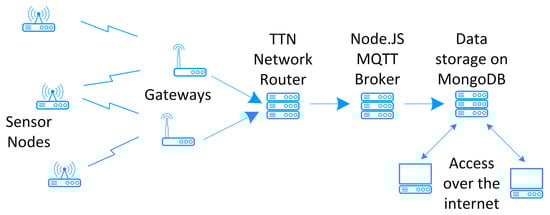 The gateways receive the data packets from the sensor nodes and forward them to the TTN network router. The TTN router is programmed to forward incoming data traffic to a Node.js MQTT (Message Queuing Telemetry Transport) broker, where the data can be extracted from the message and stored on an online database (MongoDB). Once the data has been stored, it can be queried and analysed as required over the internet (Figure 9).