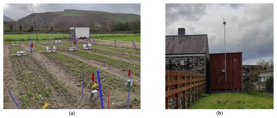 Deployment at Henfaes Research Farm, Abergwyngregyn: (a) nodes (arrowed) deployed in a wheat crop (the large, lidded boxes are measuring greenhouse gases); (b) MultiTech LoRaWAN gateway.