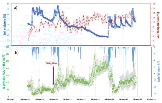 Rainfall (data collected from the nearby weather station) was distributed throughout the wheat-growing season, with intensive rainfall ranging from 4–8 mm·h−1 occurring between March and May (Figure 11b). The soil moisture content trends were relative to rainfall events as the soil sensors showed a proportional increase in soil moisture. Similarly, the soil NO3− sensors responded to the rainfall-driven NO3− soil movement, which corresponds to the spikes in the signal (Figure 11b). The NO3− sensors showed a clear signal difference before and after fertilisation, which is indicated by the arrow. The sensor readings before the fertiliser application were ca. 50 kg N ha−1 which then increased to average readings of ca. 100 kg N ha−1 after the addition of 50 kg N ha−1 N fertiliser (in the form of ammonium nitrate). At the end of April, the measurement by the NO3− sensor reached 200 kg N ha−1 before it decreased gradually with rainfall events. The signal increase could be due to the existence of low soil moisture content with prolonged soil dryness in the absence of rain and also due to the localised nitrification process in the soil. A large decrease in NO3− sensor signals was observed during the beginning of May, indicating both plant uptake of NO3−, and also the potential downward movement of NO3− through the soil to below the soil sensors as a result of cumulative rainfall flow through the soil.