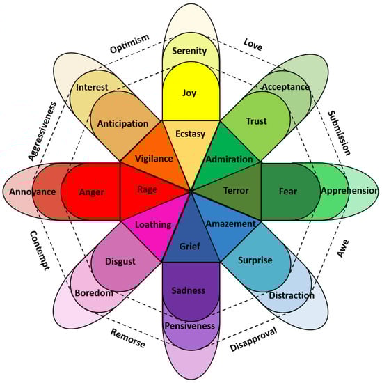 - Plutchik, R. A general psychoevolutionary theory of emotion. In Theories of emotion; Elsevier: Amsterdam, The Netherlands, 1980; pp. 3–33. [Google Scholar]