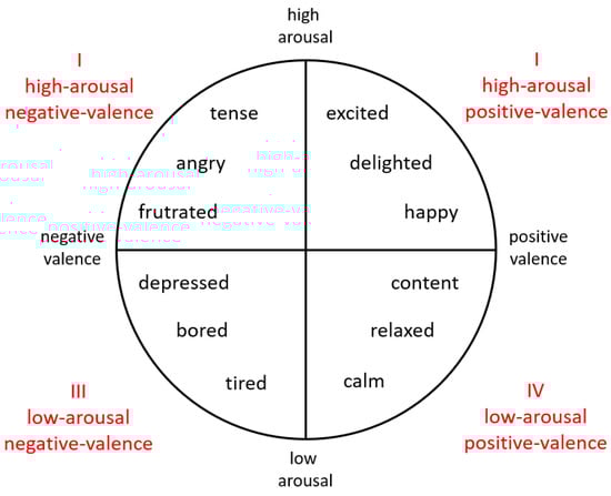 In the dimensional perspective, there are some fundamental dimensions that organize emotional responses []. Dimensional studies of emotions originated from W. M. Wundt [], who proposed that emotions can be defined using three independent dimensions: pleasure–displeasure, excitement–inhibition, and tension–relaxation axes. J. A. Russell [] introduced a circumplex model, in which emotions can be distributed in a circular dimensional space that is composed of two independent dimensions: arousal and valence. The valence dimension indicates the perception of how positive or negative the current affective state is. In the arousal dimension, the state is classified in terms of the level of activation, i.e., it measures the intensity of the emotion. As shown in Figure 2, arousal and valence represent the vertical and horizontal axes, while the center of the circle equals a medium level of arousal and neutral valence. In this model, emotional expressions can be illustrated at any level of arousal and valence or defined from four regions (quadrants).