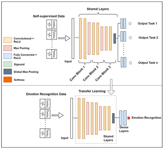 - An ECG-based emotion recognition use case that implemented multi-task self-supervised learning is proposed. A convolutional neural network is trained to learn generalizable features without labeled data using the signal transformation recognition problem as pretext tasks.