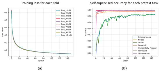 Predicting the rotation of an image [] or predicting a word by considering the surrounding words [] comprises some commonly used pretext tasks in the computer vision and natural language processing fields, respectively. An example of a pretext task for physiological signal applications is to differentiate the original signal from its perturbed or transformed version. In this example, six signal transformations are used for self-supervising a network. These signal transformations have already been used in human activity recognition problems [] and for emotions []. The transformations used in this work are summarized in Table 1 below.