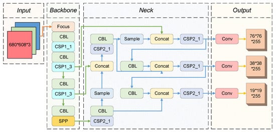 The network structure of YOLOv5 is presented in Figure 1. We can see that the YOLOv5 consists of the backbone network, neck network, and head output, which are utilized for feature extraction and fusion, object detection, respectively. The Backbone layer extracts feature mappings of different sizes from the input images by multiple convolutions and pooling. The Neck network utilizes the pyramid structure of FPN and PAN to fuse features at different levels, which enhances the capability of feature fusion. From these new feature mappings, The Head networks perform object detection and classification. The CBL module in YOLOv5 mainly consists of convolution, normalization, Leaky activation function, etc. Two cross-stage partial (CSP) improve inference speed and accuracy by reducing model size. In addition, the Spatial Pyramid Pooling module (SPP) performs maximum pooling and concatenates features for fusion.