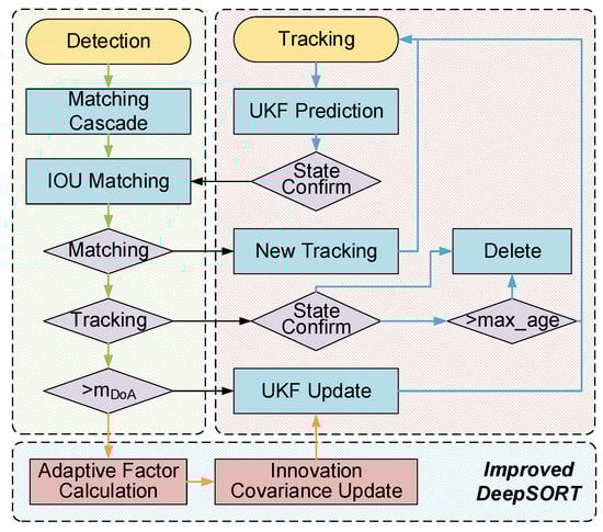 Considering the accelerated motion model, the degree of nonlinearity of the system is exacerbated by the uncertainty caused by occlusion, noise, etc. The performance of the classical Kalman filter on nonlinear motion is not satisfactory. Thus, we design an improved DeepSORT algorithm based on the unscented Kalman filter for multi-object tracking. In addition, the results of the detection algorithm YOLOv5 are utilized as the observations, which are severely disturbed by random observation noise during the multi-object tracking process. Therefore, we propose an adaptive unscented Kalman filter by adjustment of the observation noise covariance matrix to enhance the tracking robustness and accuracy. The improved DeepSORT algorithm framework is shown in Figure 2.