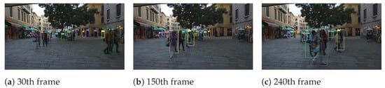 To reflect the multi-object tracking performance, object number 5 in the MOT15-02 sequence, object number 1 in the MOT15-05 sequence, object number 1 in the MOT15-10 sequence, and object number 10 in the MOT15-13 sequence are visualized. We can see from Figure 3, Figure 4, Figure 5 and Figure 6 that our algorithm in this paper continuously tracks object number 1 from frames 15, 260 to 370, and object number 10 from frames 20, 110 to 360, etc., showing a satisfactory tracking effect.